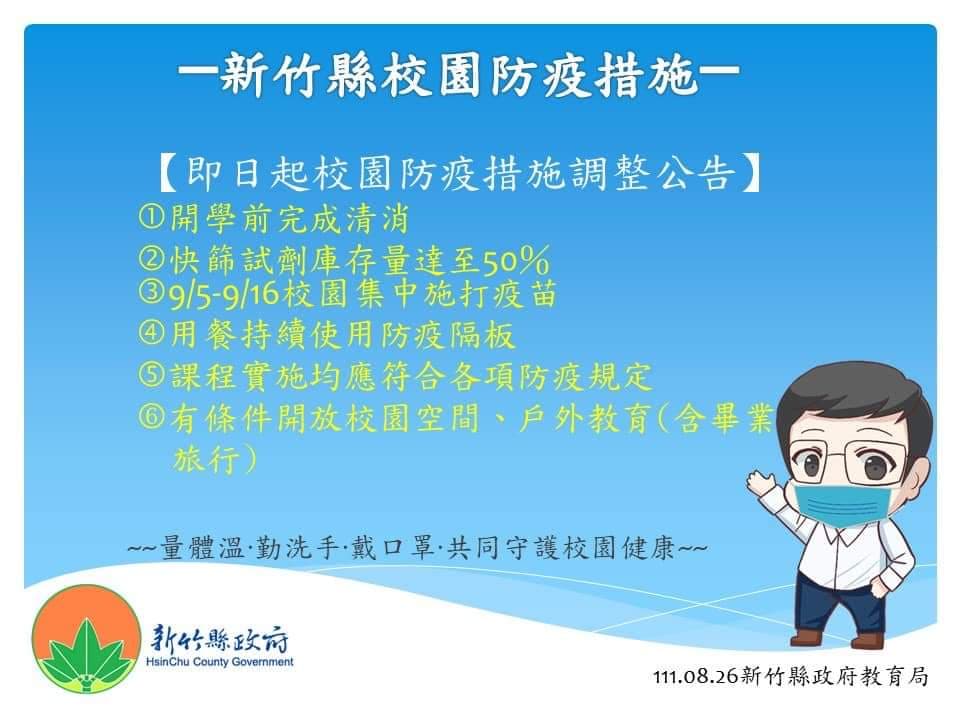 另外配合中央防疫政策,8月30日開學當天開放家長依防疫規範陪同小一新生入校,家長入校量體溫、戴口罩,學校上課時間外適度開放校園空間,並有條件開放戶外教育、畢業旅行讓學生的學習多元而豐富,除此之外,為利國小學童安全,規畫與衛生局合作9月5日至9月16日安排校園集中施打疫苗,以提升施打率並提高快篩試劑庫存量由30%至50%,以作為因應。